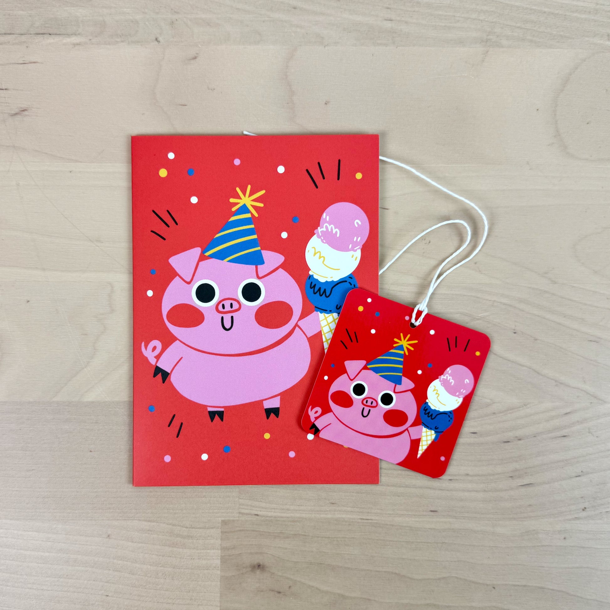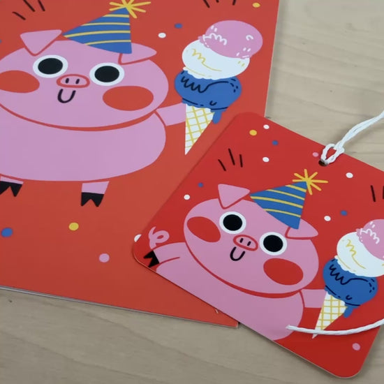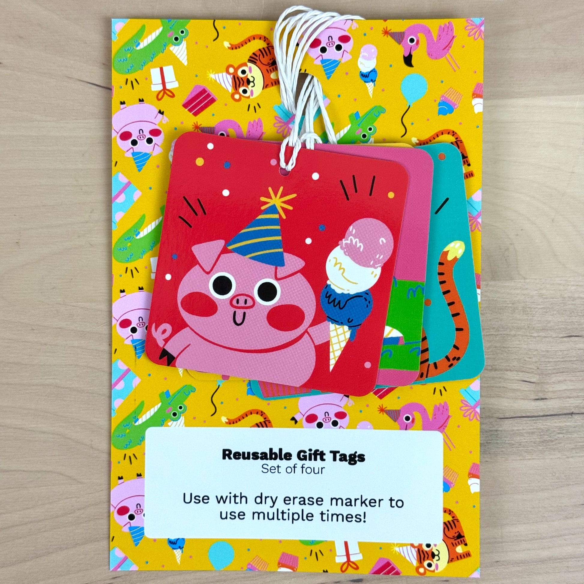 Party Animals set of four birthday greeting cards with matching reusable gift tags
